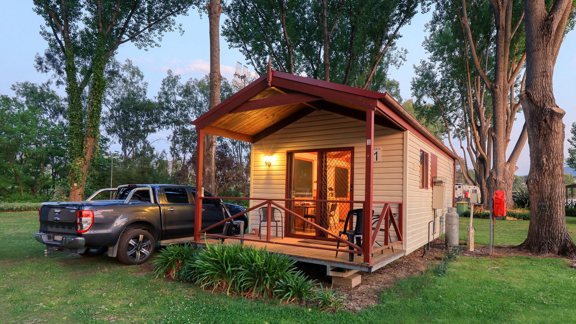 Self contained cabin with queen bed and single bunk bed. Please note: This cabin has no toilet or shower. Queen bed is made with towels & soap. Bedding/Linen can be provided for bunk bed at extra cost. Split system heating and cooling, TV, DVD player, microwave, cook top, fridge, iron & ironing board. No Pets Allowed with Cabin Bookings.