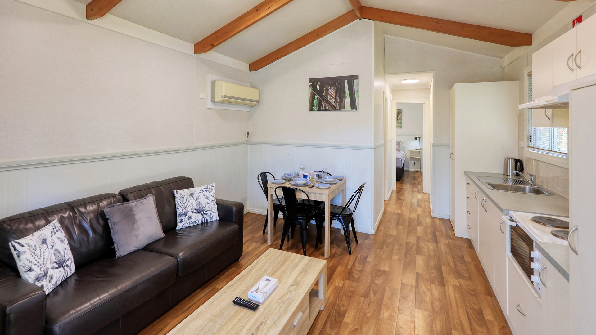 Self contained cabin with queen bed and bunk bed with double on bottom and single on top. Please note: This cabin has no toilet or shower. Queen bed is made with towels & soap. Bedding/Linen can be provided for bunk bed at extra cost. Split system heating and cooling, TV, microwave, cook top, fridge, iron & ironing board. No Pets Allowed with Cabin Bookings.